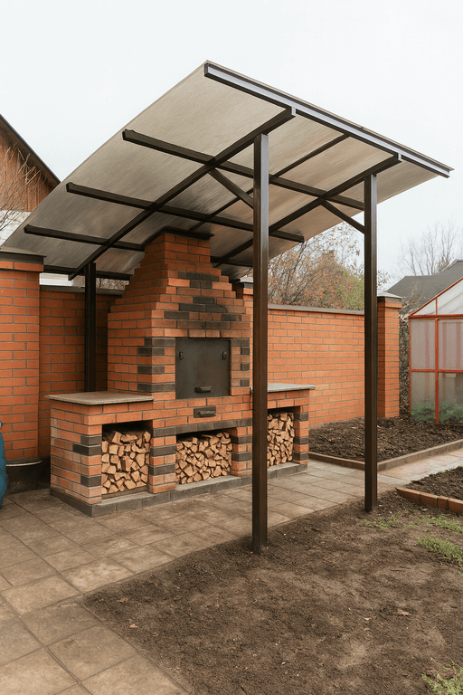 - Размер и форма: навес под мангальную зону изготавливается по индивидуальным размерам — цена зависит от масштаба и особенностей размещения.