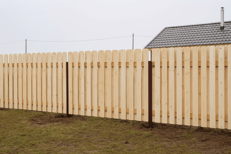 Для забора из деревянного штакетника применяются металлические или деревянные стойки, которые устанавливаются с шагом 2–2,5 метра и надежно бетонируются для предотвращения просадки. - Монтаж горизонтальных лаг